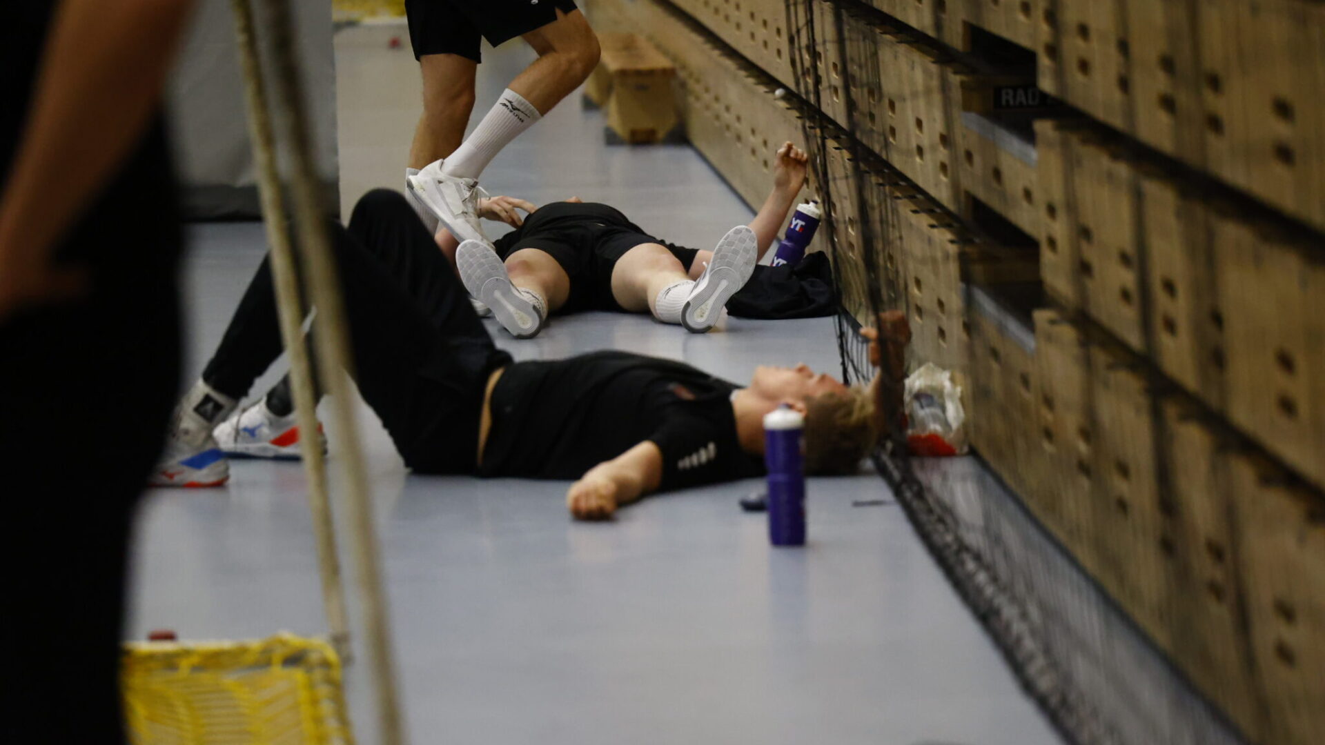 Ved siden av ham ligger spillerne hans utslitte etter onsdagens blytunge løpetest.