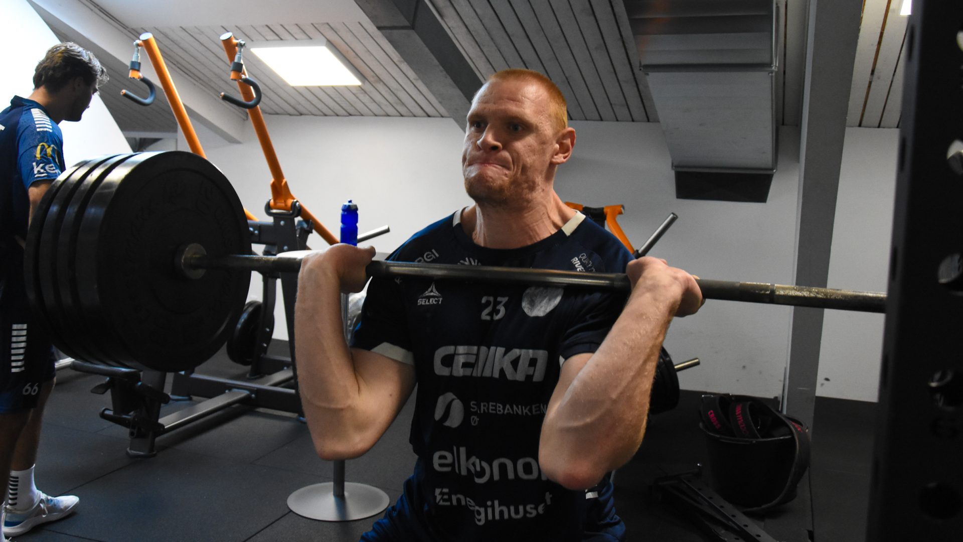 Jonatan Goksør Bjerkrheim trer støttende til når målvakten Oscar Larsen Syvertsen putter på mye jern på stanga under benkpressøvelsen.