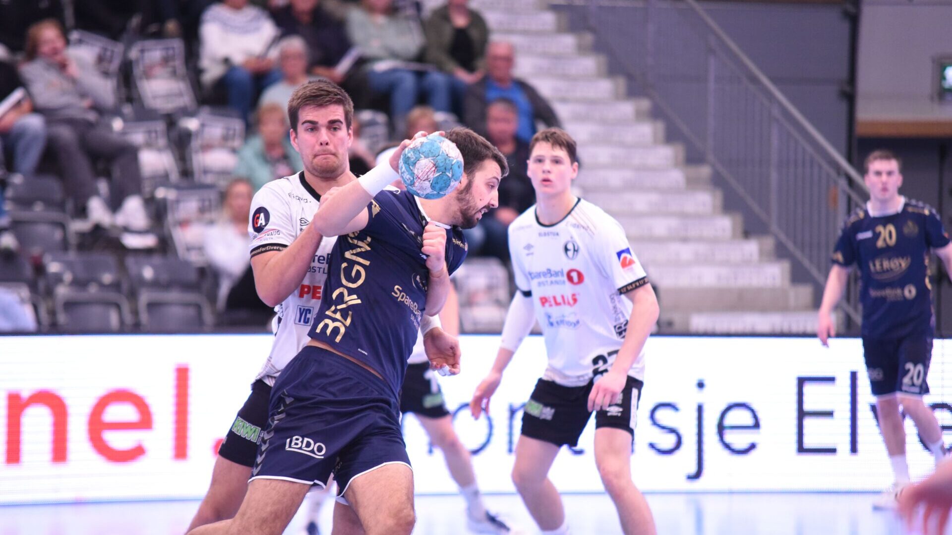 Selv om Elverum hadde kommandoen så ga ikke nyopprykkede Bergen seg. Rasmus Carlsen gjorde en fin kamp for vertene, og dansken sørget for stillingen var 10-8 etter at Kassem Awad hadde satt sin første scoring for kvelden etter 22 minutter. Elverum hadde flere muligheter til å øke ytterligere, men det ville seg ikke helt for Børge Lunds gutter i slutten av omgangen. I stedet var det Bergen som tok over momentet i kampen. Inn mot pause mistet Elverum den ledelsen de hadde opparbeidet seg, og lagene gikk i garderoben med 12-12 på tavla. En svak avslutning på omgangen av et Elverum som kunne takke Morten Nergaard for at det ikke så dårligere ut til pause.