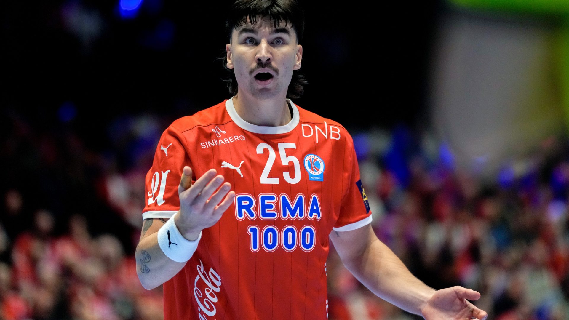 Fornebu 20250122. Norges Tobias Schjølberg Grøndahl under VM-kampen i håndball mellom Norge og Spania i Unity Arena. Beate Oma/NTB