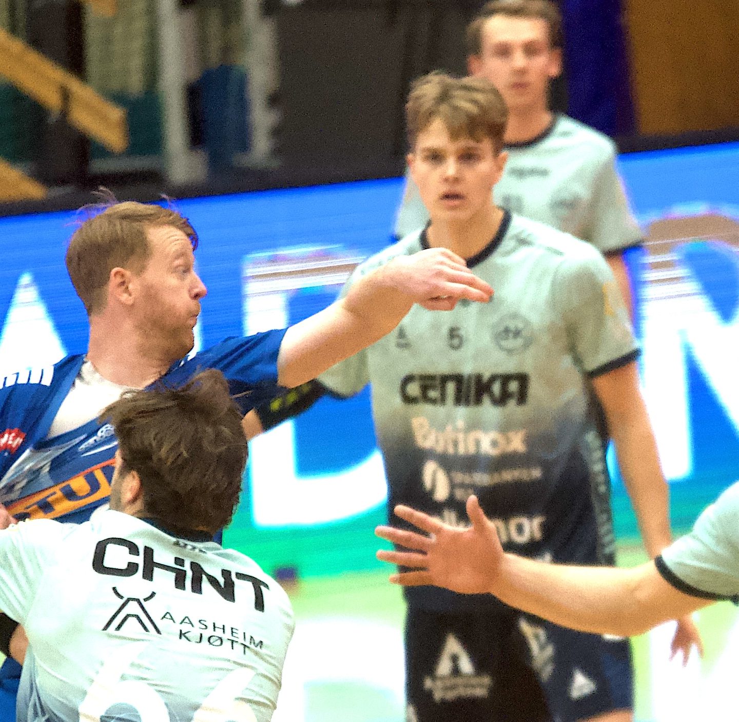 Mot slutten av første omgang tok Sandnes mer kontroll. Linjespiller Jakob Falk Lorentzen satte inn et viktig mål etter flott innspill fra Johansen, før Adrian Holgersen Vikra avsluttet omgangen med et kontant skudd fra distanse. Sandnes gikk til pause med ledelse 14–11 etter et solid forsvarsspill og godt kollektivt angrep.