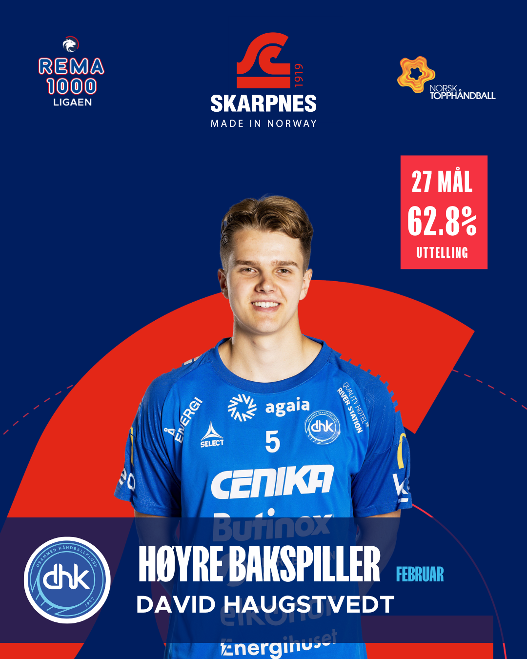David Walstad Haugstvedt har levert solide prestasjoner for Drammen i februar. Med 27 mål på fem kamper og et snitt på 5,4 mål per kamp har han vært en viktig bidragsyter offensivt. Han står også med 28 assists, noe som viser at han ikke bare ser etter egne avslutninger. Uttellingsprosenten på 62,8 og et MEP-snitt på 4,3 understreker en stabil og produktiv måned.