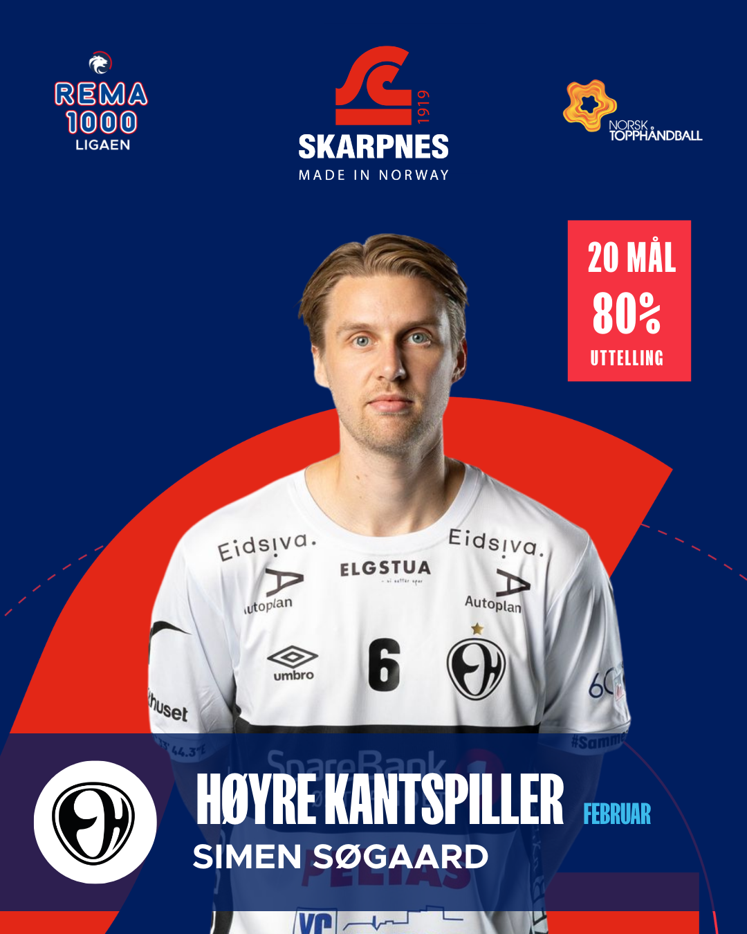 Simen Søgaard har levert en effektiv måned på høyrekanten for Elverum. Med 20 mål på fem kamper, et snitt på fire scoringer per kamp og en uttellingsprosent på 80, har han vært en sikker avslutter når sjansene har kommet. Et snitt på 2,8 i MEP understreker en stabil og solid periode.