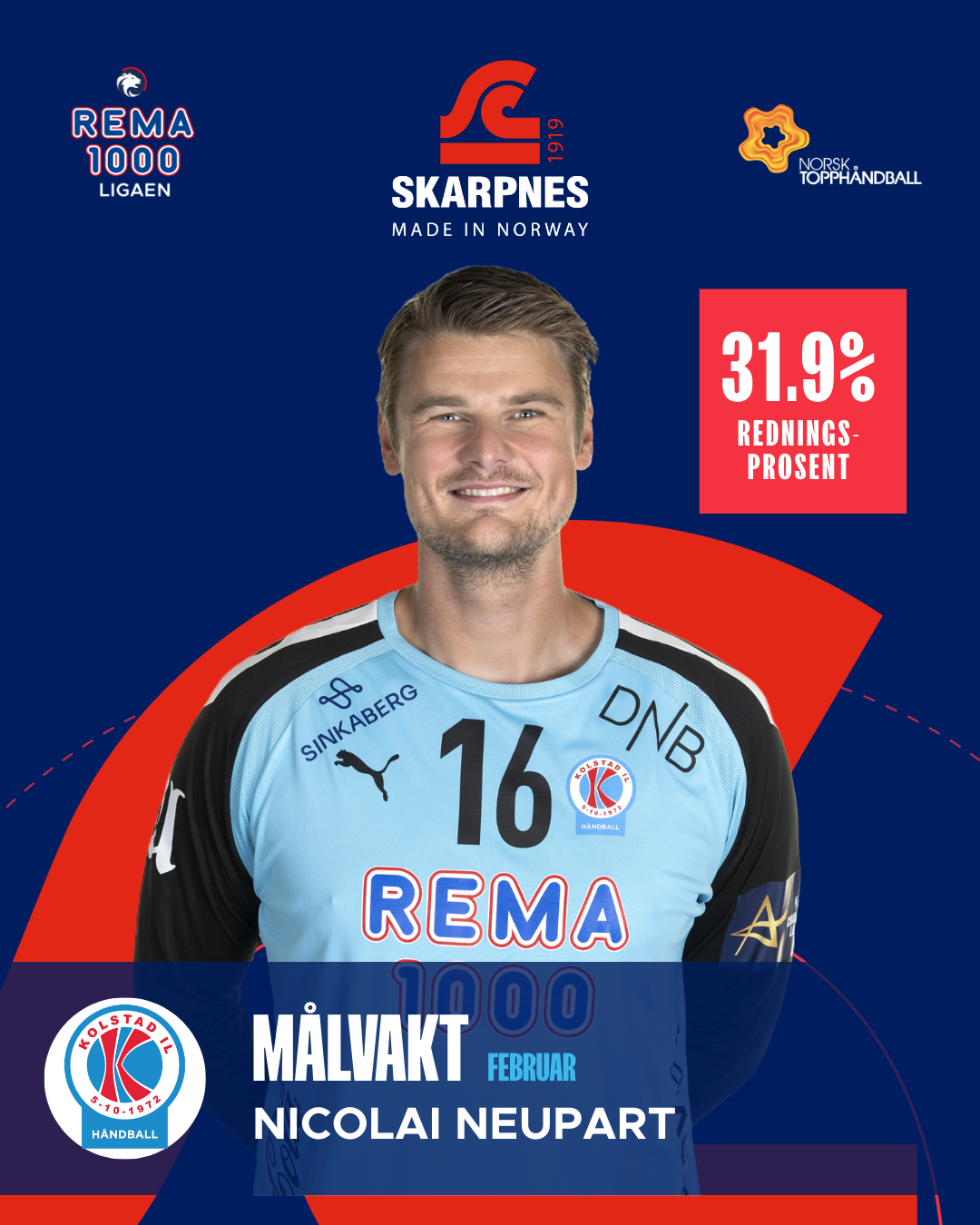 Nicolai Neupart har voktet buret for Kolstad med autoritet i februar. På fem kamper har han notert seg for 42 redninger og en redningsprosent på 31,9. Han har levert viktige inngripener i avgjørende faser av kampene og gitt laget trygghet bakover. Med et MEP-snitt på 1 har han bidratt jevnt gjennom måneden, og vært en viktig brikke i Kolstads kamper.
