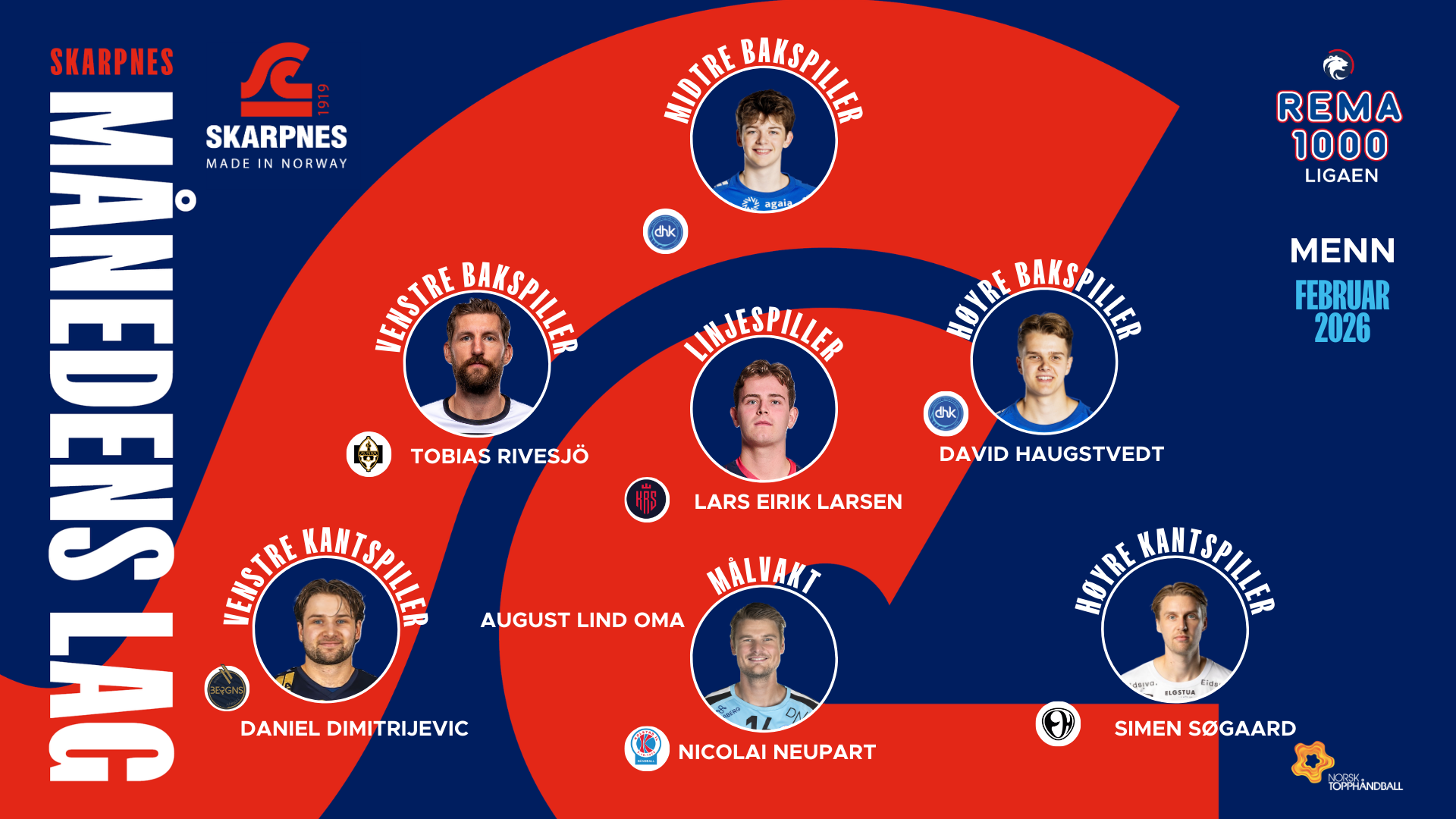Februar har bydd på tette oppgjør, sterke enkeltprestasjoner og flere spillere som virkelig har tatt ansvar for lagene sine. Her er Skarpnes Månedens Lag i REMA 1000-ligaen for menn.