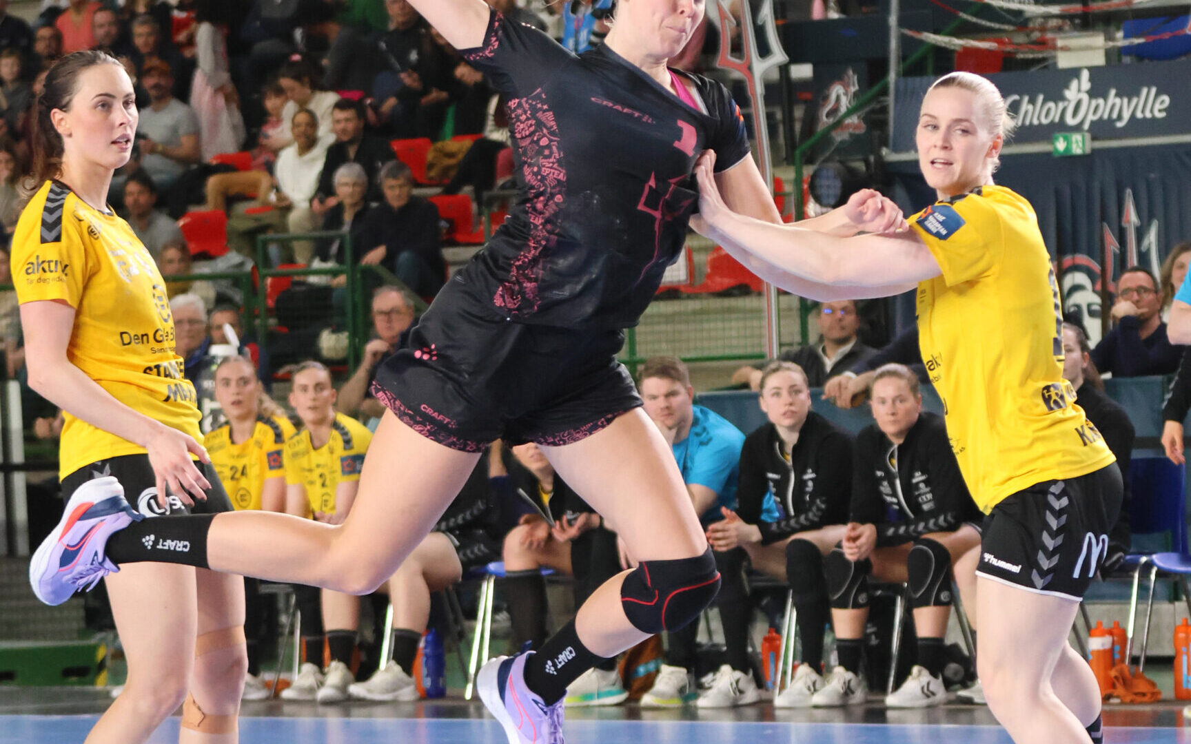 Jentene gikk ut i et forrykende tempo, og viste gode takter ved å gå opp i 4-0 ledelse tidlig. Dette gjorde at Nantestrener Helle Thomsen tok en tidlig timeout. Dette så ut til å gi effekt, og Nantes rodde seg sakte, men sikkert inn i kampen. Lagene fulgte hverandre tett etter dette, men med Nantes som det førende laget både 1 og 2 mål foran. Etter en jevn første omgang, gikk vi inn i garderoben 1 mål bak på stillingen 16-15.